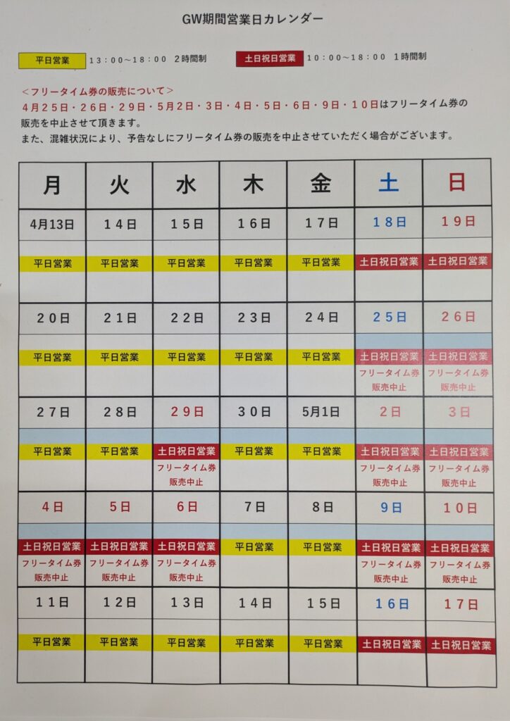 諸事情によりフリータイム券の販売は、予告なしに中止させていただく場合がございますので予めご了承下さい。